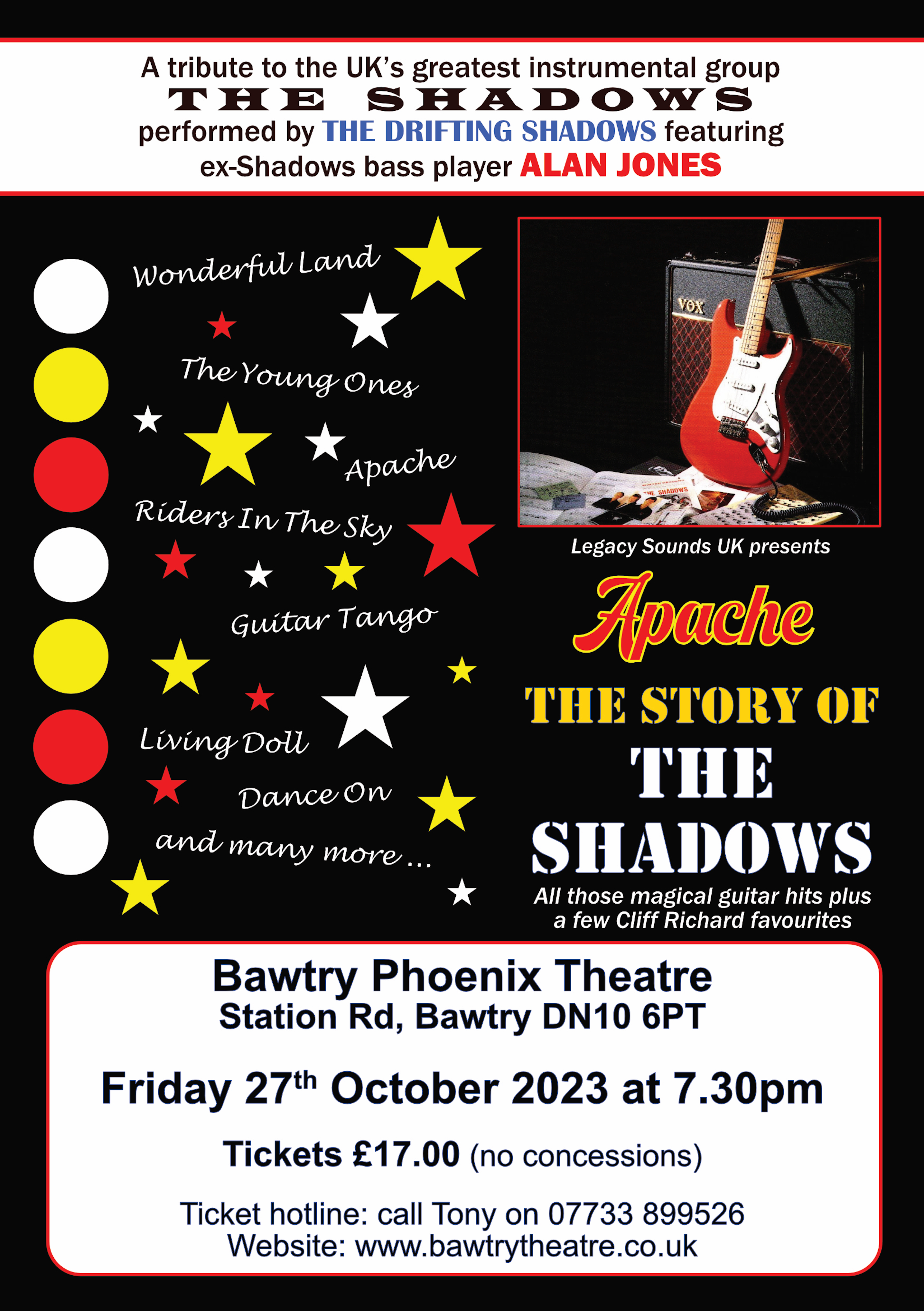 The idea is to present a chronological history of our heroes' music from pre-Apache days right up to the period featuring Alan. The first date has been confirmed at the Bawtry Phoenix Theatre DN10 6PT on Friday 27th October, with more dates to follow.