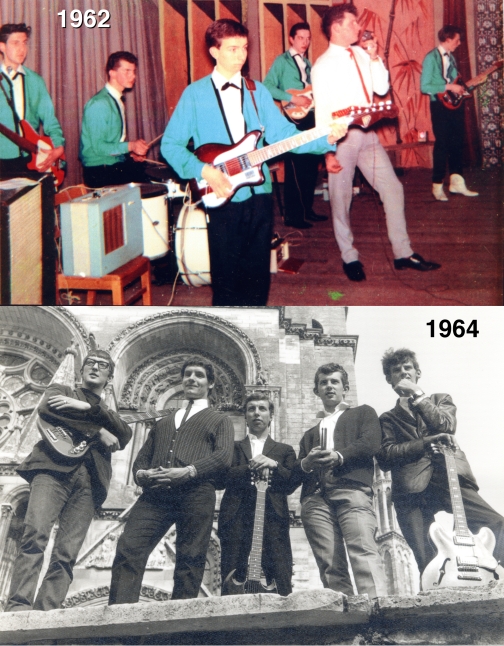 The top pic is my first 'real' group, The Stormbreakers. We were semi-pro and worked around the Midlands. Note the extra lead guitarist, third from the right. I'm the one on the right with the boots and the Burns Sonic. The bass player, on the far left, is playing a his home-made fretless bass. This picture was taken in 1962 at Harshill High School, near Nuneaton, where we played many times to a very appreciative crowd, especially the girls!