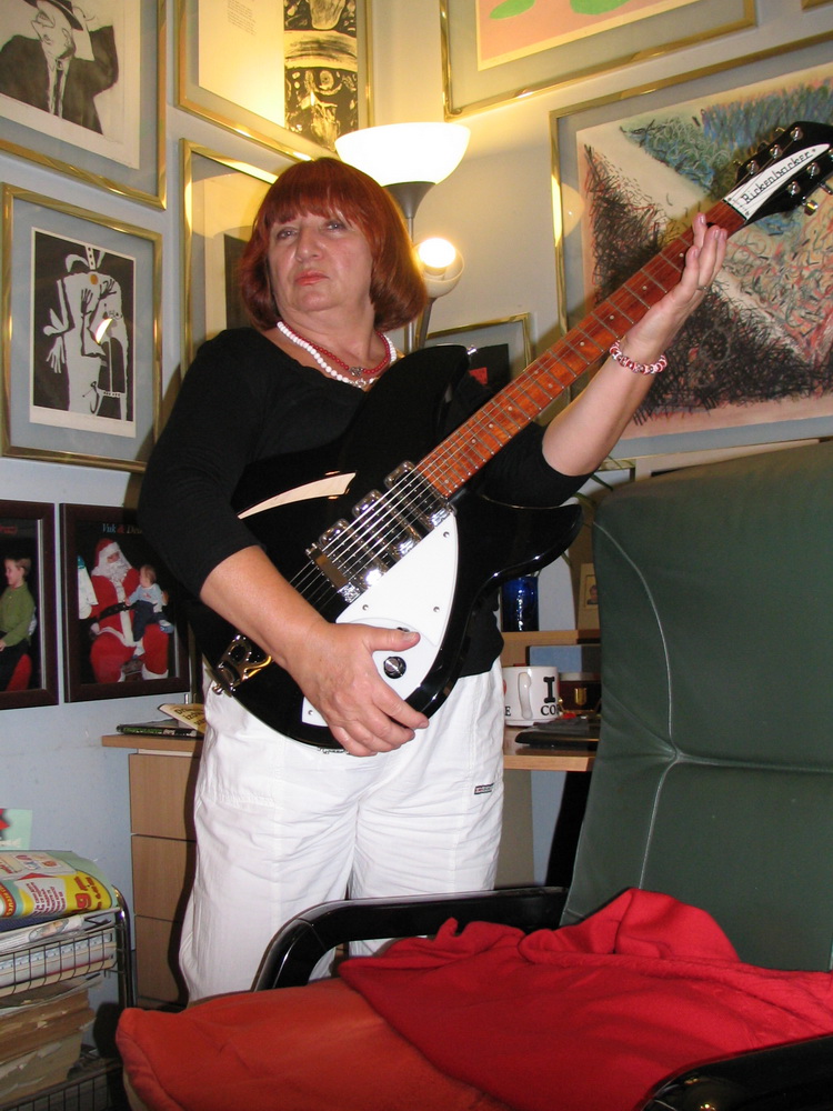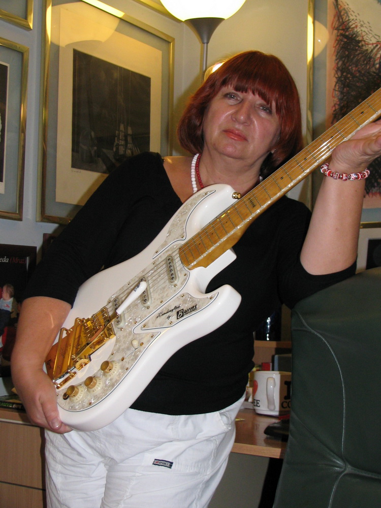 Anyway, last night about 50 friends came over to our house to celebrate the birth of my (fourth) grandson . . . Of course I was showing off my guitars to those that were interested. When a very old and dear friend came to my work room to see the guitars and I noticed that she was wearing the three colors of my guitars: red, white, and black, I asked her to pose for me while I took some pictures. Here is how they came out.