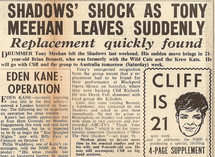 NME Artikel 10 aus. Oktober 1961 Shadows" Shock Tony Meehan Blätter plötzlich