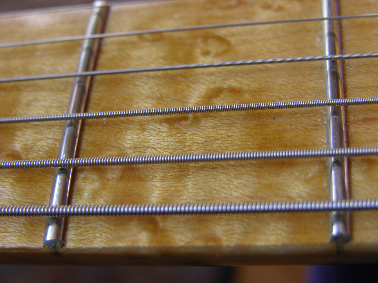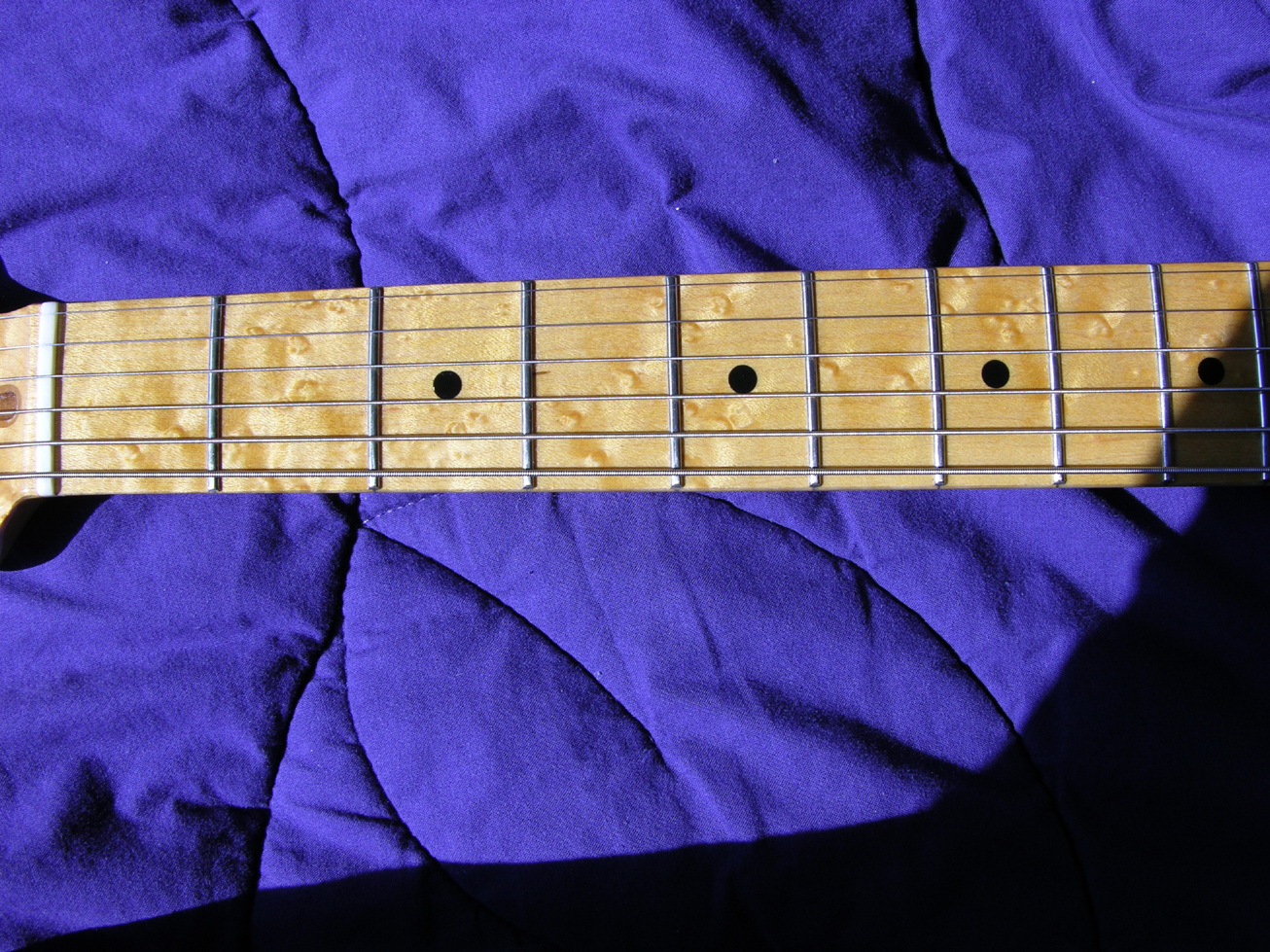 Geoff, I don't have any full length pics of the front or back, but I have some neck and bridge pics showing the Callaham bridge and saddles. I am also attaching a picture of my entire guitar collection, including Daphne [left to right: Burns Apache, Daphne, Coral (also made by Alan), and Rick] and a picture of a friend of mine playing Daphne. I hope that will be satisfactory.