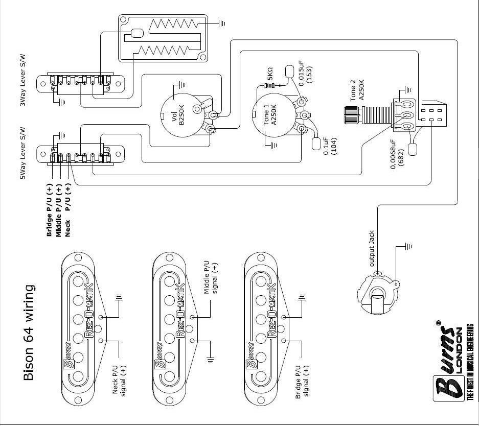 Hi, I am new to the forum, and I hope I'm not asking something that's already out there. I have just bought a gorgeous Bison 64 Club to go with my White Marvin, Greenburst Double 6 Club, White Baldwin 60's Double 6 project, Green Steer with cutaway and 1961 Black Bison 4 pickup ( serial number 71 - as seen in Burns adverts at the time). I have a problem with the Bison 64 which is the fairly rare version with a 5 way pickup toggle switch and a 3 way tone toggle switch. Unfortunately, the wiring has been 'played' with, and although I've tried to make sense of it to put it back to original spec, I'm not at all convinced that I've got it right. Does anyone please have an original wiring diagram for this variation - or maybe could take some close up photos of their guitar that I could use as a template to rewire it correctly ?. Thankfully, the twin choke and capacitor are still in the guitar.