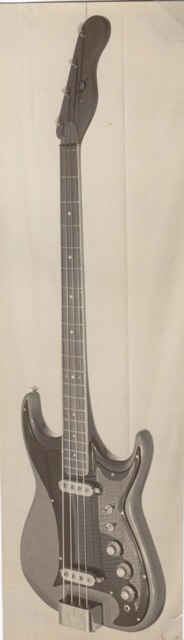 The Artist Deluxe bass is partnered by a pic of the prototype Bison four-string. This earliest example followed in the footsteps of the four-pickup Bison guitar, employing similar styling and the same construction, complete with a heel-less, glued-in neck/body joint. Note other shared features, such as the 'cigar-tube' tuner cover and Ultra-Sonic pickups, although the electrics were more akin to those on the Artist Deluxe. The bridge/tailpiece was also as per the latter, but unusual touches included the white-button Van Gent machine heads, wooden thumb-rest up near the neck, a body-mounted mute device clamped on the strings at the bridge, what looks to be a truss-rod cover aft of the nut and a 23-fret ebony fingerboard. The end result was very unlike the eventual Bison bass design, and also differed to the next prototype that appeared alongside the four-pick Bison guitar in the 1962 Rose-Morris catalogue, although this second version incorporated aspects of its predecessor and the eventual production model.