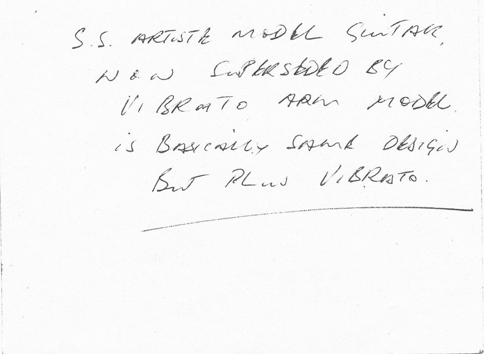 The note Bill mentions was indeed written by Jim Burns, but I certainly don't recall suggesting it was a note to Ike Isaacs. It actually appears on the back of a studo shot of the Artist and Jim's description refers to the addition of the first Burns vibrato tailpiece. The appropriately re-named Vibra Artist was introduced in May 1960, but here Jim does nothing to help settle the name game, instead harking back to his past by preferring S.S. Artiste. Of course it would've answered all arguments if Jim had employed a proper model reference headstock badge, as on the accordingly easily recognised Sonic, but for some reason he stuck with just 'Burns London', causing many subsequent owners/sellers to then use the Burns 'Tri-Sonic' title, this being the only name apparent on these guitars and basses.