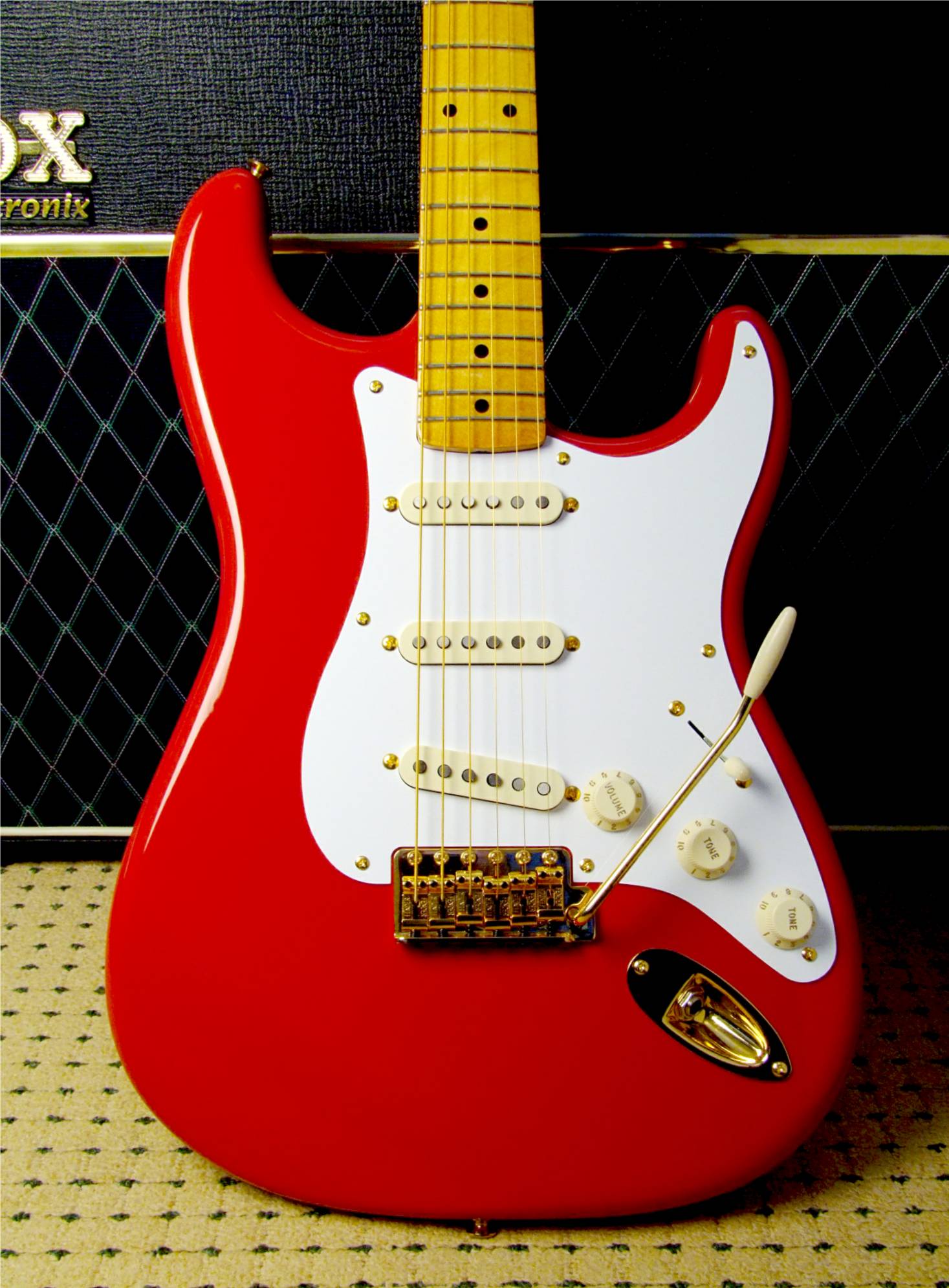 I've got a couple of other Mexican Strats (the all gold 'Homer Haynes' 50th Anniversary & the white Hendrix LSR one) and it's surprising how different they all are in terms of weight, 'feel' & sound. This new one's definitely a good 'un and is also the lightest. Strangely, it's a good 2mm or so thinner than the other two, so that's probably got a lot to do with it. The previous owner had the bridge pickup wired to the middle pickup's tone control and I think that's one of the best mods that you can do to a Strat and I'm tempted to have my other two done as well. I was also a bit surprised that the colour wasn't as vibrant as I'd expected. It's certainly more subtle than my Burns Shadows Custom and more similar to the red of the Oasis special run Stratocasters.