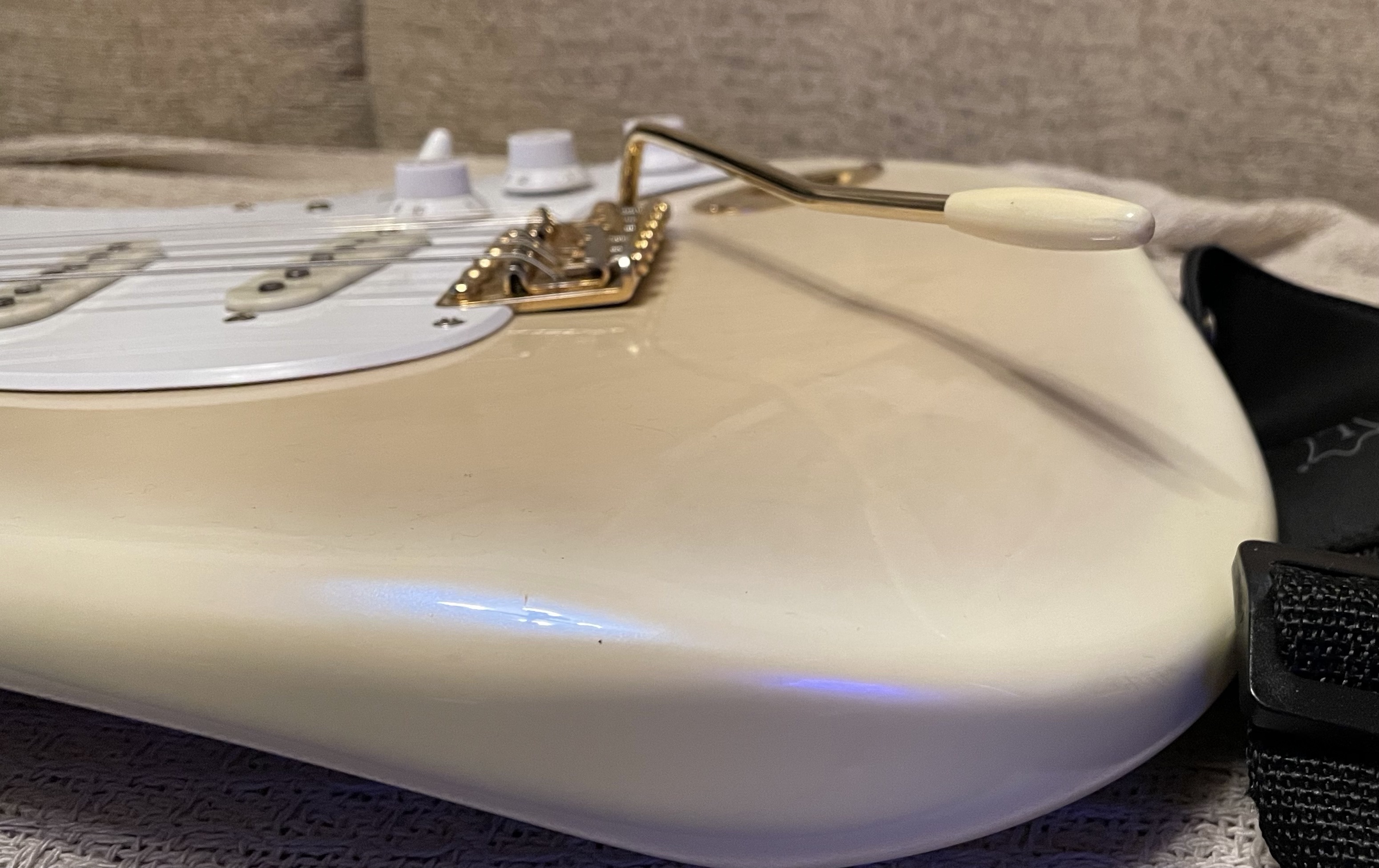 By the way, the strings leave an imprint on the inside of the top cover, which shows how closely the case cradles the guitar. I assume the cover will press against the vertical corner of the trem arm, if left on, and likely the length of the arm as well.