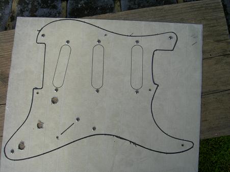 Hi I thought It was a great idea to make my own Scratch/ Pickguard, not knowing what colour I wanted or how many holes (8 or11) I gave it a lot of thought and decided on a Brass 8 hole for a 50s Strat..........How many hours I have spent on this I'll never know, but believe me it's one of the most boring long winded jobs I've ever done, but the finnished article looked good..........Until I left it for a couple of weeks and the brass had tarnished making it unuseable.............It's now at the Gold platers.......Maybe a lesson to be learnt here.........GET A READY MADE ONE