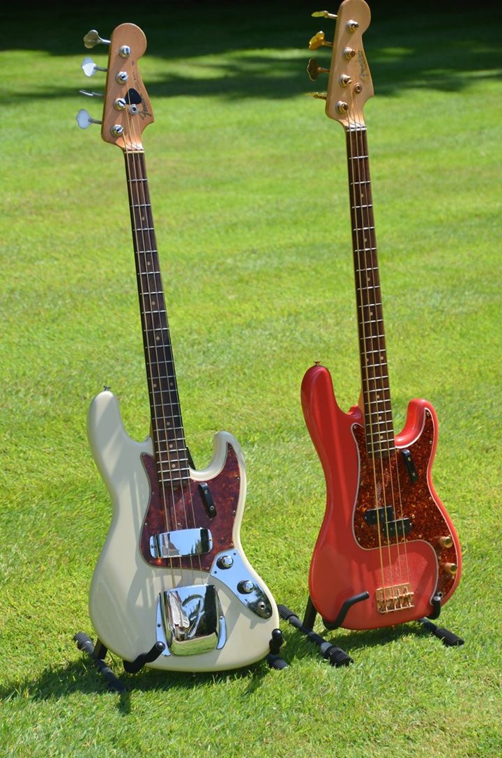 These are the guitars with the strings fitted to the two 61 fenders. Note the gold plating on the Precision Hardware done because the strings didn't look good with chrome.