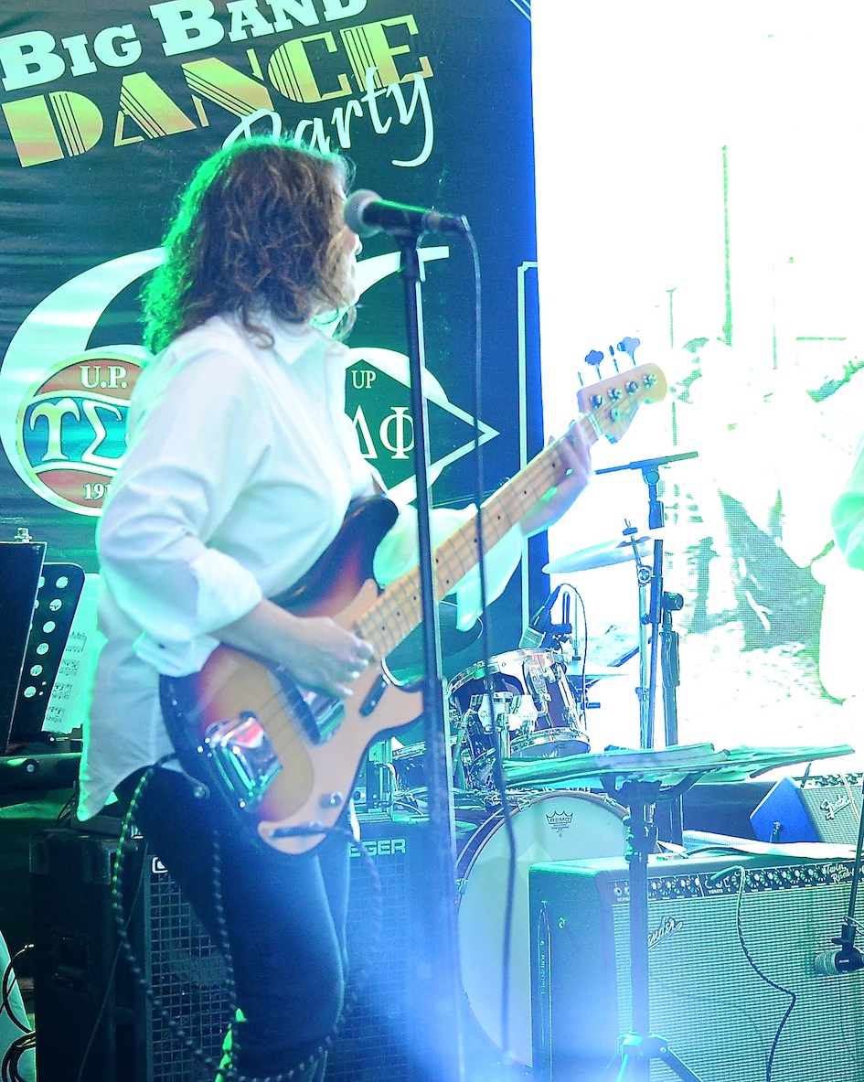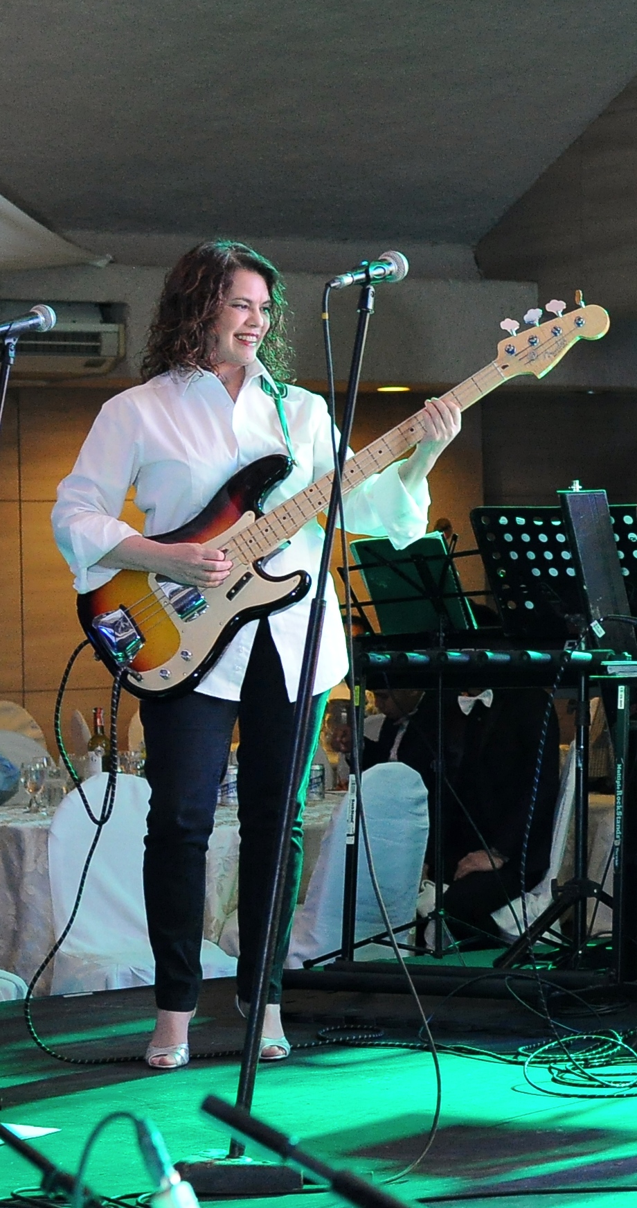 Here’s our bass guitarist Anna at a university homecoming we played at the other month. We played just early Ventures pieces, as it was a dance party (and it is hard to find enough Shadows dance pieces!). Accordingly, Anna used her sunburst Precision Bass, ala Nokie Edwards. Nokie played with the bridge and pick-up covers on, so Anna plays that way too. Of course, Jet Harris used a sunburst P-Bass for Apache, I recall with the covers on too. Note the period leather strap and the vintage-style cable. We got to be consistent!