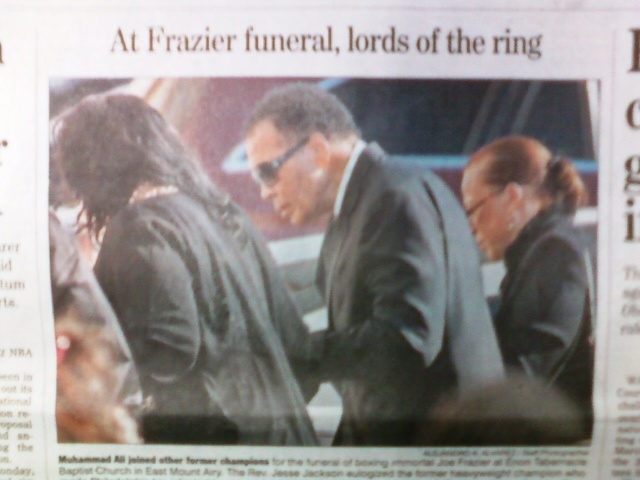 This is a photo of Heavyweight Boxing Champion Muhammad Ali, paying his respects at the casket of fellow Heavweight Champion, the late Smokin' Joe Frazier. The funeral was held in Philadelphia yesterday (November 14th).