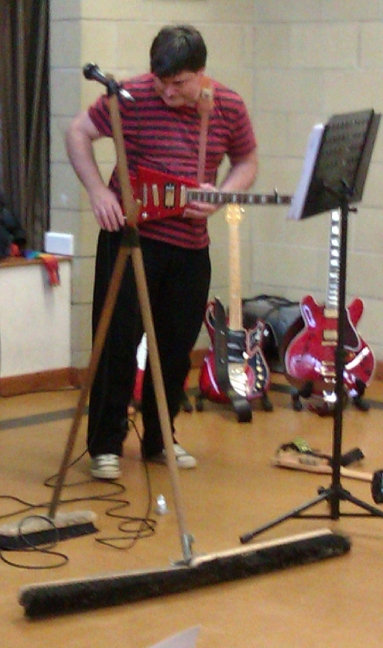 Yesterday at the West Of Wales Shadows & Guitar Club we road-tested the latest in mic b(r)oom stands. This totally new concept is infinitely adjustable for height and angle, thanks to state-of-the-art gaffer-tape technology. The new stand has an additional advantage over its opponents in that it can be used after gigs to clean up the stage.