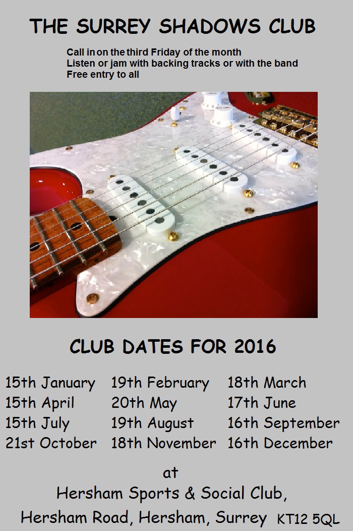 The Surrey Shadows Club welcomes everyone to their musical evenings, whether you sing, play guitar, bass, keyboards or drums. We have a full backline sponsored by Breakthru', our resident backing band for the meetings.