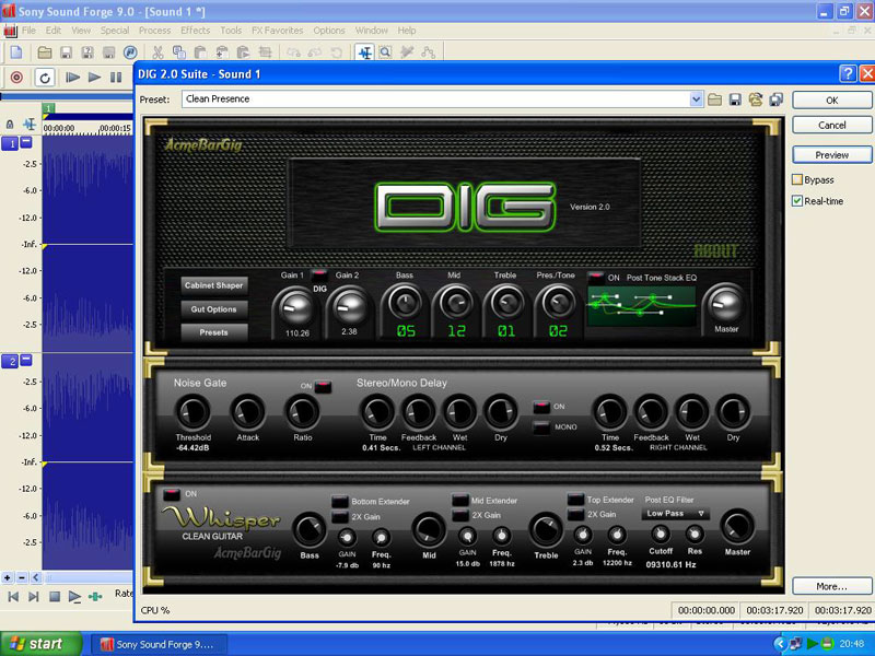 DIG 2.0 is a full featured VST Guitar Amp simulator based on 2 12ax7 Tubes. Features include Stereo Delay, Noisegate, Cabinet Shaper, Manual, and a separate amp designed specifically for Clean Guitar, called Whisper. Presets with the ability to download and upload presets from acmebargig.com. No Hooks, No Junk, just enjoy and make sOme great music.