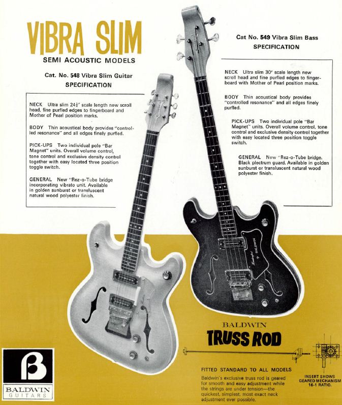 If I recall correctly, the 1967 RRP on the Baldwin Vibraslim (with short Rez-O-Tube and stacked pickups with a secondary coil which could be brought into circuit by the "Density" control), was 127 guineas (£133 / 7s / 0d or £133.35).