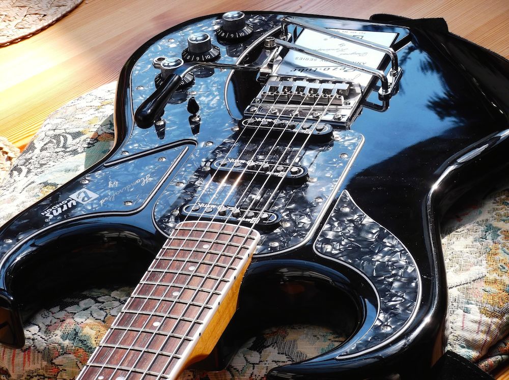 Because I was a little unhappy with the perloid pickguard of my new Burns Bison, I ordered a black one from Mr. Gibson in London and changed them. The Guitar looked so much better to me - and didn't work! No sound, just some noise and a very thin tone! What happened? One of the members in the german music forum noticed, that there was no ground wiring (don't know, if this the correct word in English) between poti and switch. So I found out the reason: The perloid pickguard was pasted with one piece of aluminum foil, but the new one with two overlapping pieces of foil that were not electrically connected! So I put a little piece of aluminum foil unter the screws and the problem was fixed finally.