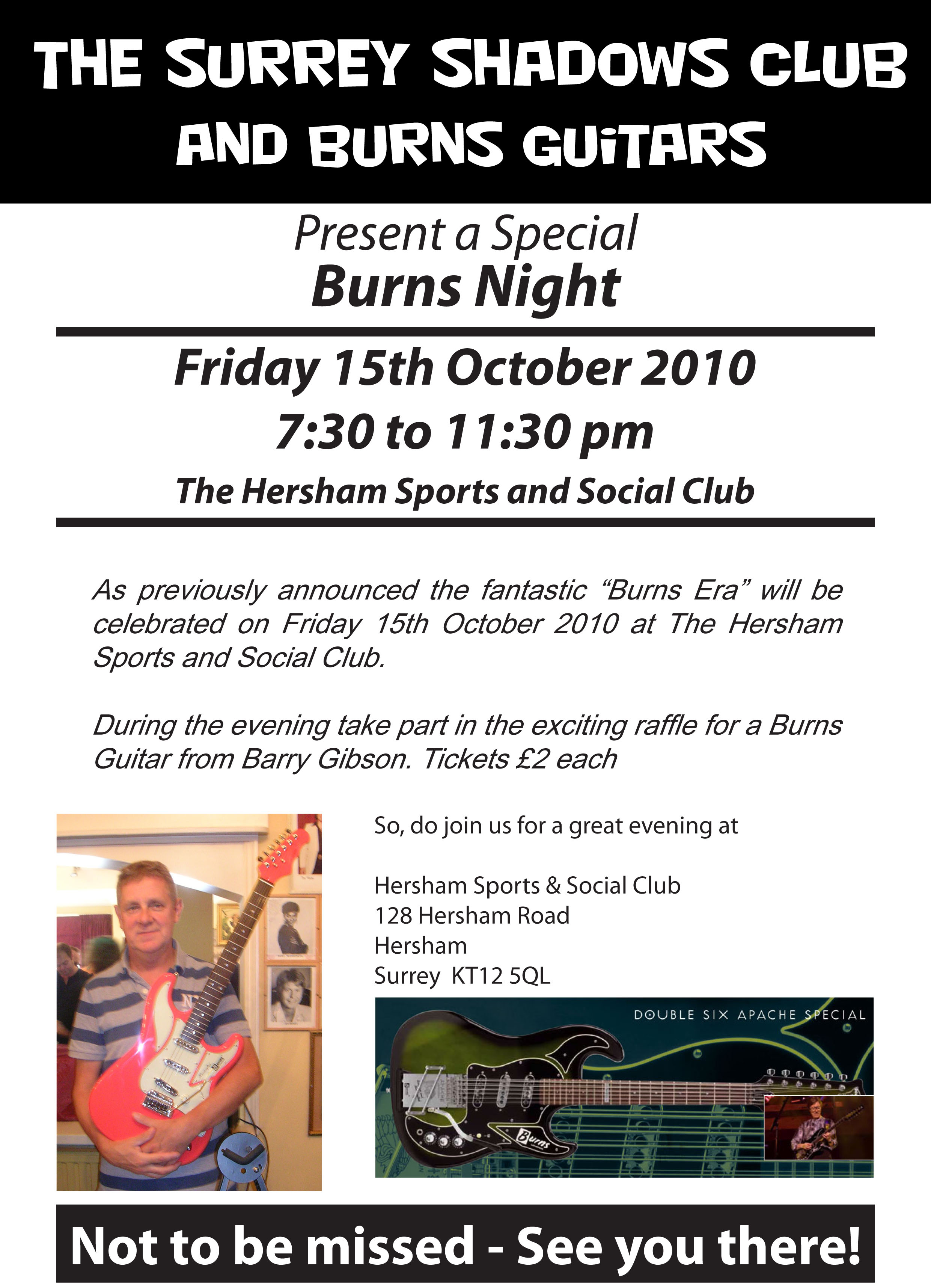 We are pleased to inform readers that we have agreed with Barry Gibson the date for the special BURNS NIGHT at the Surrey Shadows Club will be on Friday 15th October 2010 from 7:30 to 11:30pm. Full details to be published next week in our invitation poster.