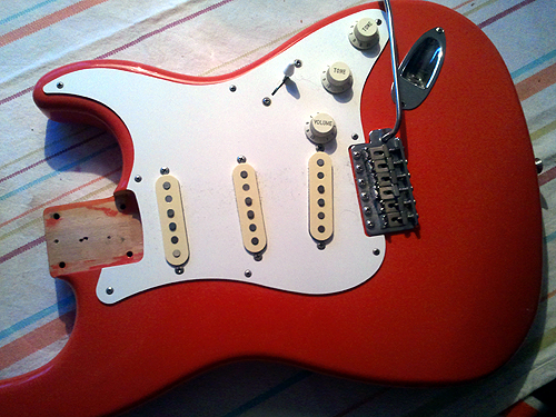I bought a Classic Vibe body (Fiesta Red of course) a couple of years ago while in the US. I added a Fender Classic Series maple neck and a Fender MIM Standard trem with steel block. With 57/62 pickups installed, it is a very playable instrument with a most pleasing tone. When changing out a trem, you need to make sure the replacement has 2-1/16" mounting spacing - not the vintage 2-3/16" or 2-7/32" spacing.