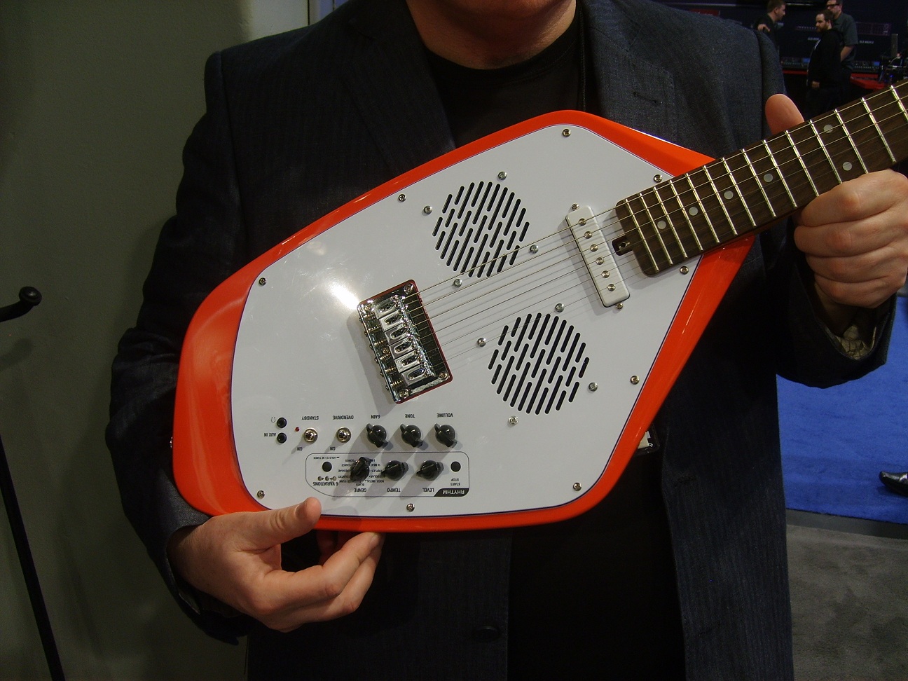 Thanks to Abel for the NAMM 2012 pics of those Vox Apache guitars, clearly showing the two different shades of red used on them (the one without a speaker in the back was a medium-scale bass).