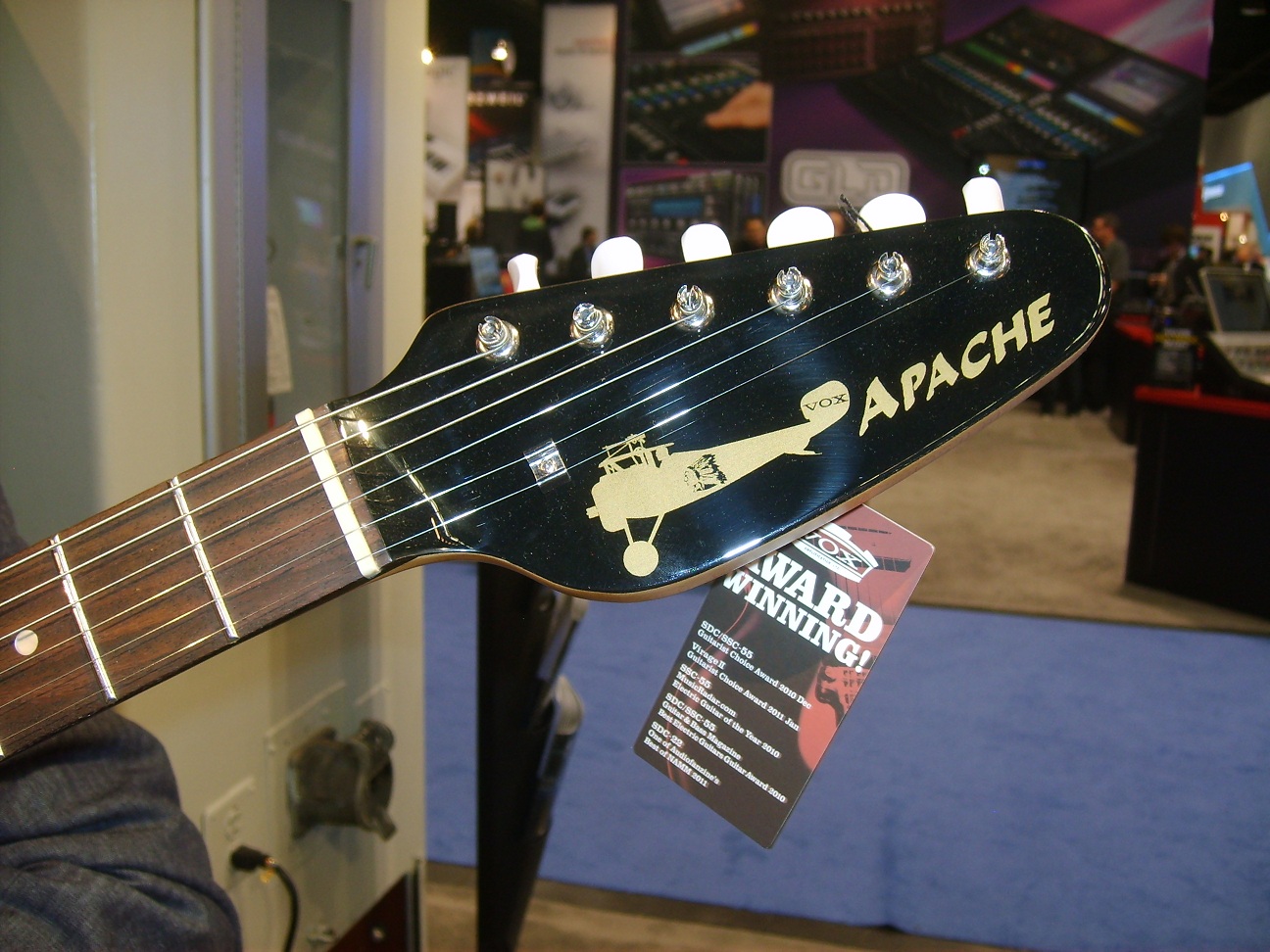 The Korg stand had loads of Vox amps and those now Vox guitars, but also had a range of new guitars under the name "Apache". They were all based on the Phantom and the Phantom Mk VI (ie, the Teardrop). All had just one pickup and a load of knobs for effects and rhythm (this was a real chip off the old Jennings block).
