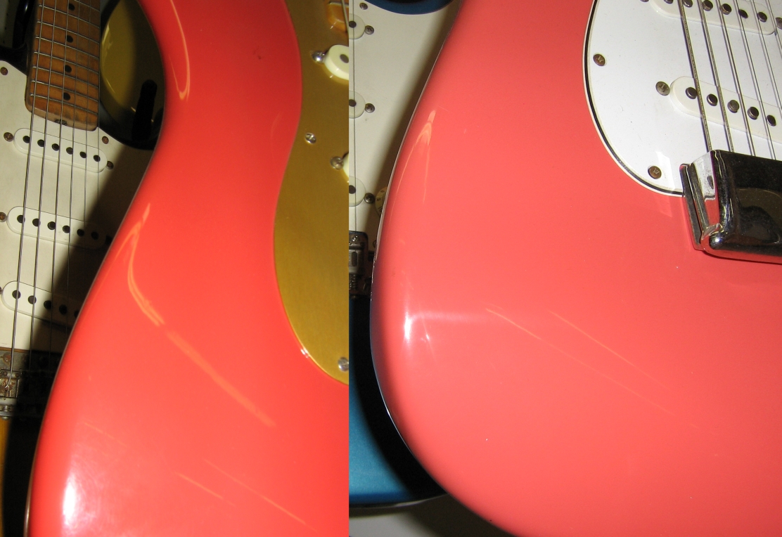 A few days later, I was back at History for Hire in Hollywood and took these two photos in fixed lighting conditions. They are untouched except for cropping and being pasted into the same shot for easy comparison. Only one of them is clearly Fiesta Red. The other is in Coral Pink (the "lipstick" shade in which many of Fender's offset guitars - Jaguar, Jazzmaster, Jazz Bass) were finished).