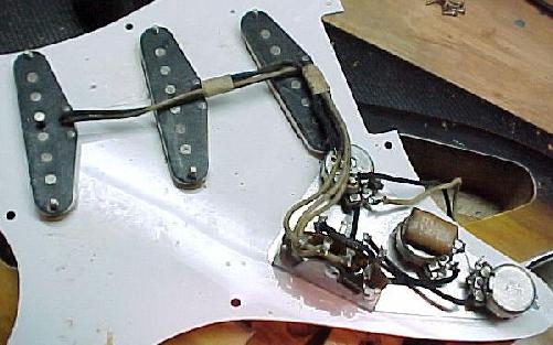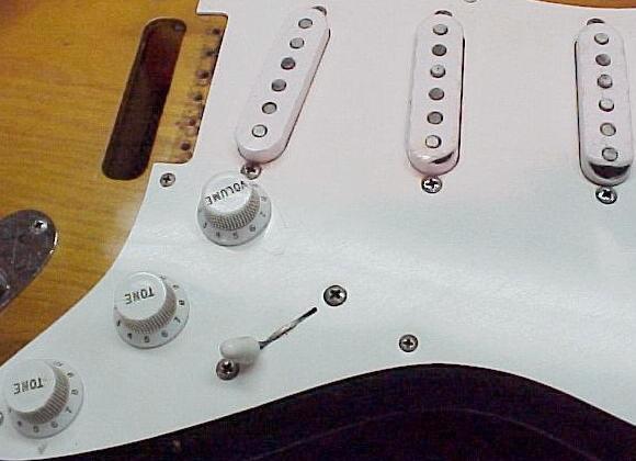 4. The unusual (“hybrid”?) stagger found on Hank’s guitar, which is similar to the vintage stagger, but has the G pole pushed downward so that it matches the high E in height. The G polepiece is “pushed in" because it protrudes from the bottom of the pickup. According to Gary, these may have been usual on 1954-55 Strats.