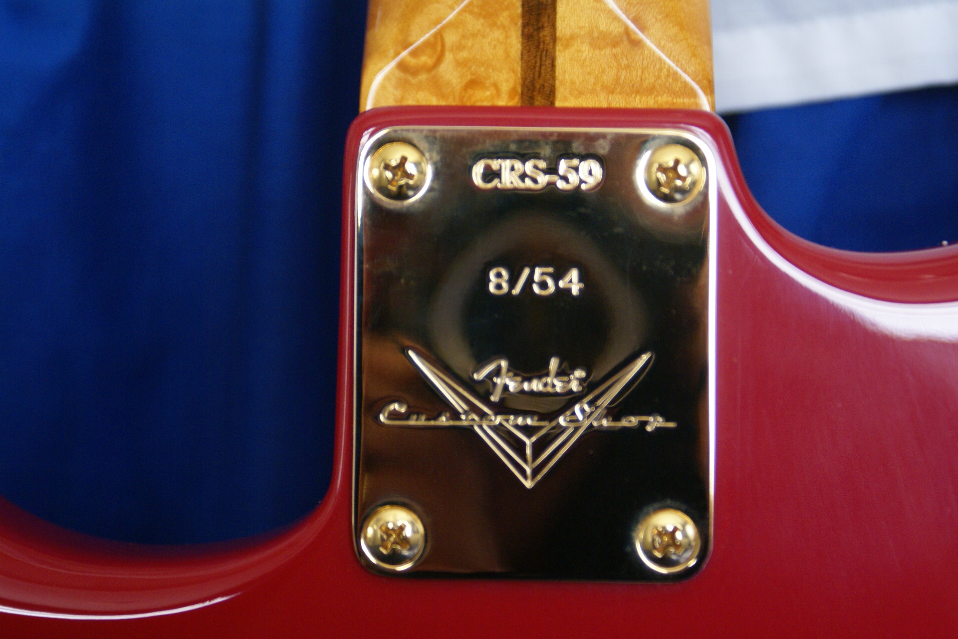 You could take it to indicate 'Custom Red Special' or 'Cliff Richard/Shadows' as you wish. The Custom Shop certificate describes the guitar as a 'Dealer Select 1959 Stratocaster NOS Custom Red'. The '54' in the serial indicates the total built but also coincides with the year of the Strat's commercial introduction.