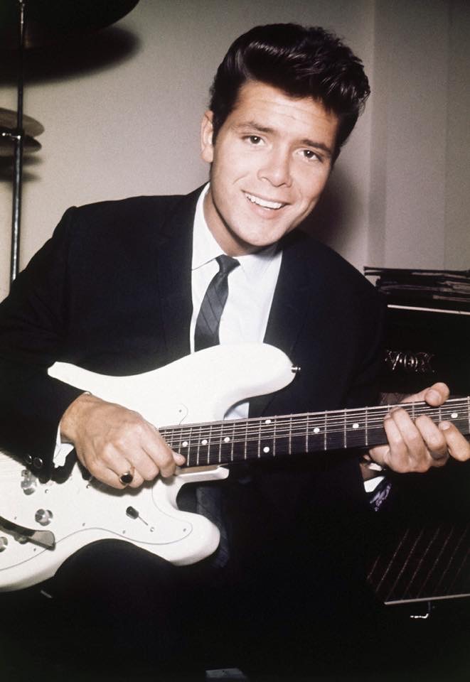 It looks like an electric solid body 12 string- but doesn't look like a Fender, Burns, or Vox - possibly a European brand? From Cliff's hairstyle etc, it looks to be from 60-61 era?
