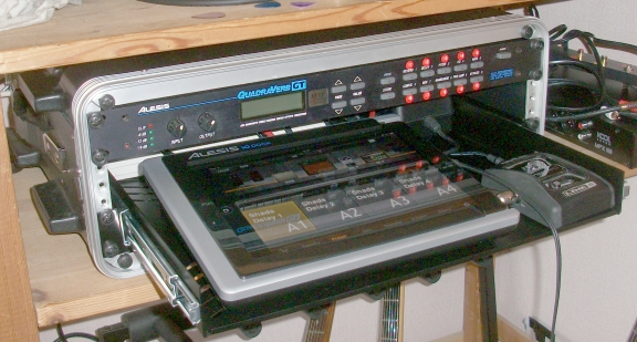 3 unit rack case containing Quad GT for EFTP and iPad (housed in Alesis i O Dock) on pull-out sliding rack shelf, Line 6 digital guitar wireless system.
